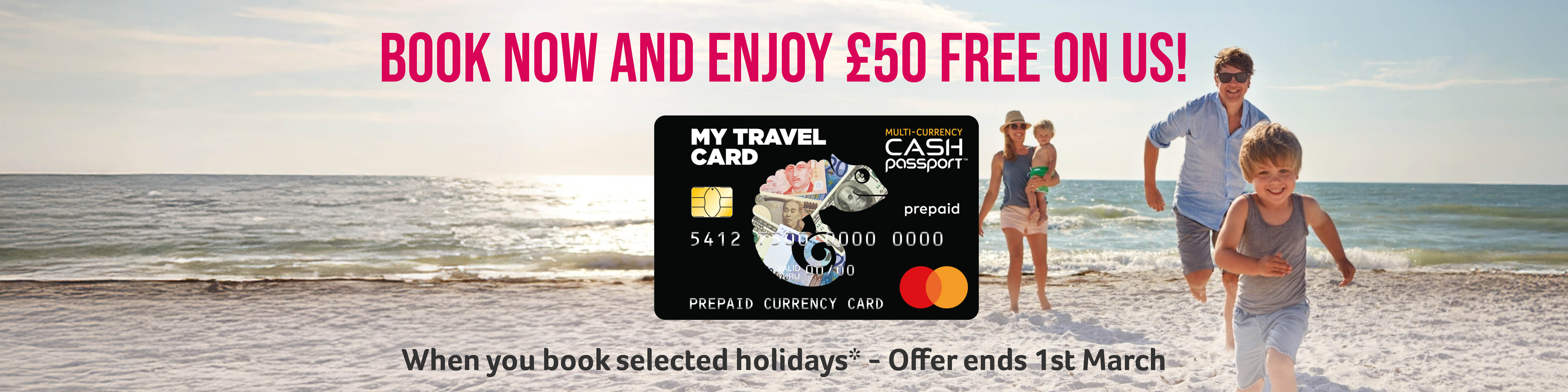 Enjoy £50 FREE holiday spending money when you book selected holidays*. Book in branch today and get £50 loaded to a My Travel Card Cash Passport™ Mastercard.