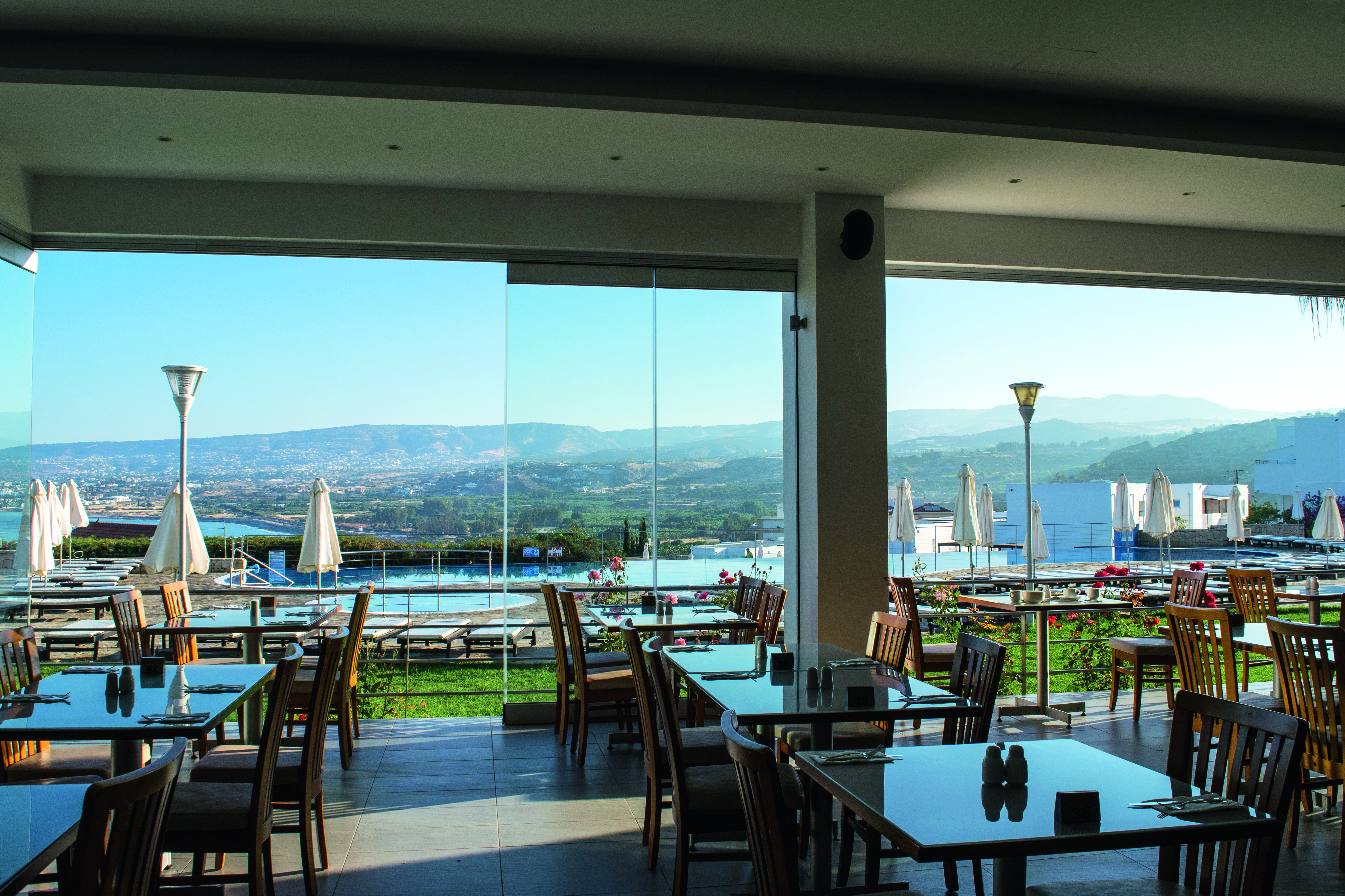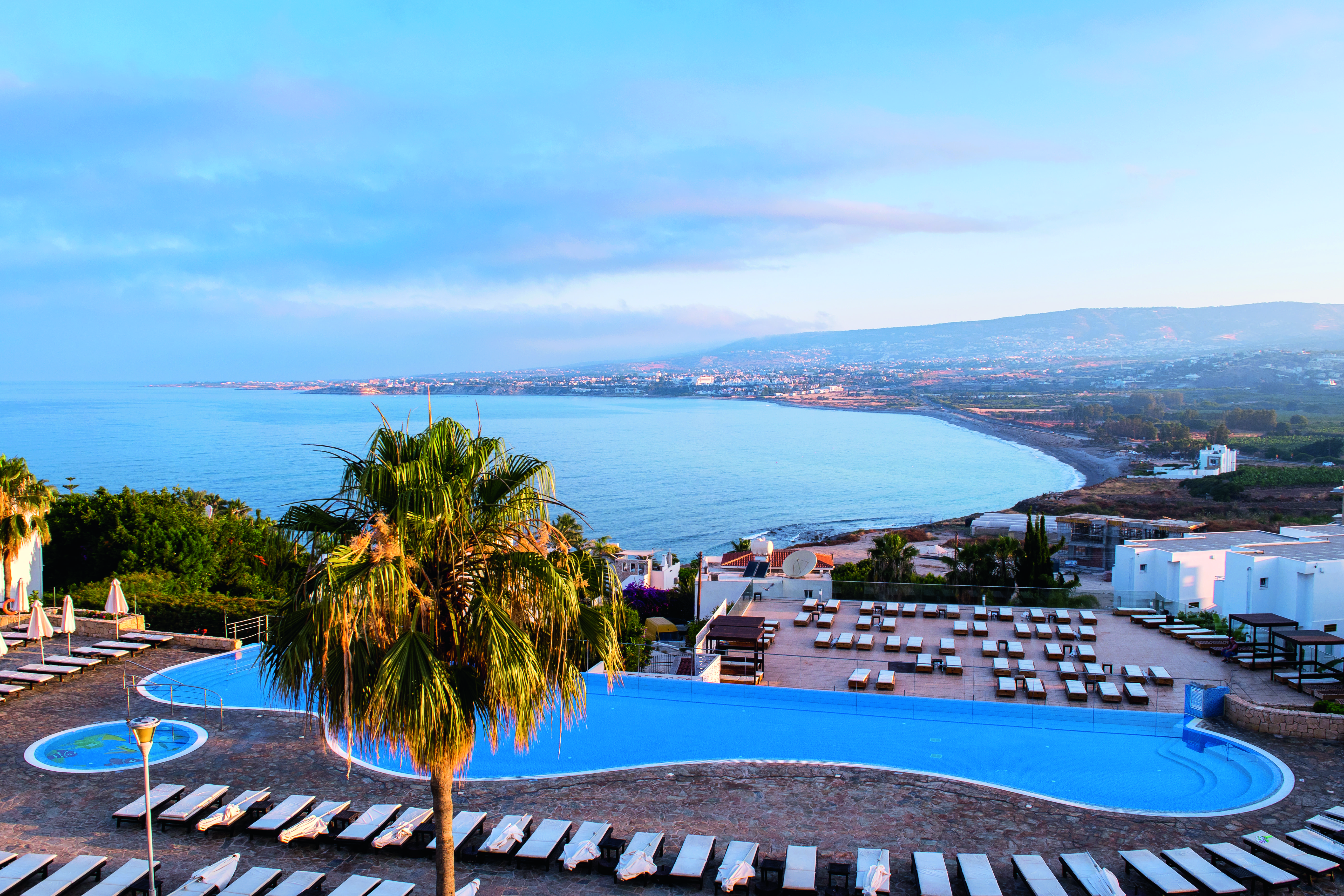 This place is all about the views – there’s a large swimming pool with vistas of the Mediterranean Sea. Plus, a duo of restaurants serves up global and Cypriot dishes.