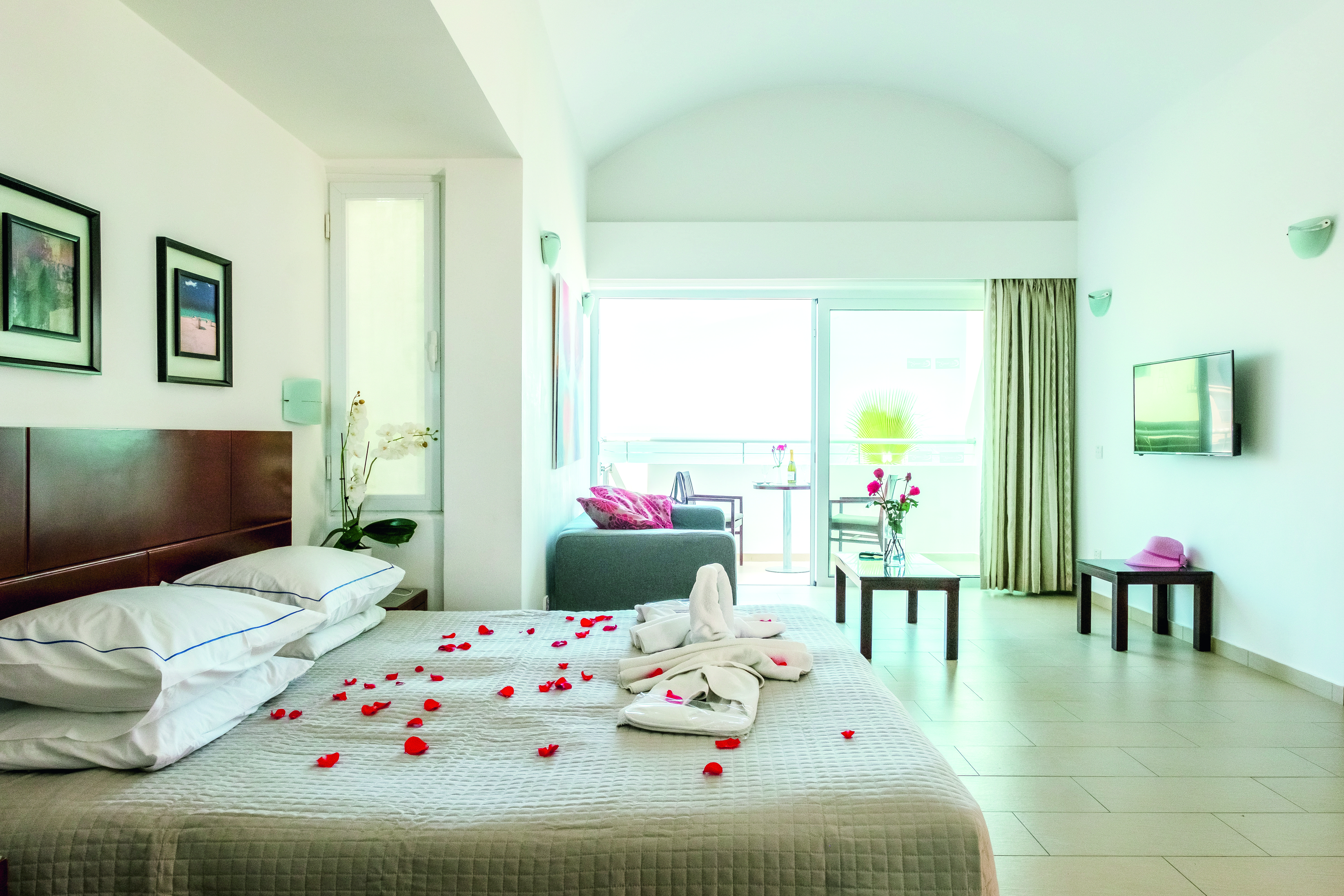 Adults have a choice of two pools – one on the terrace, and a heated number indoors. There’s a childrens’ swimming pool, too. A snack bar dishes up tasty treats, and you can also dine in a traditional open-air taverna or a buffet restaurant. Sport-wise you can play a game of tennis on the hotel’s court, and on the beach there’s a water sports centre. The health club is the place to be for relaxation – there’s a sauna, a steam bath and if you’re feeling active, a gym.