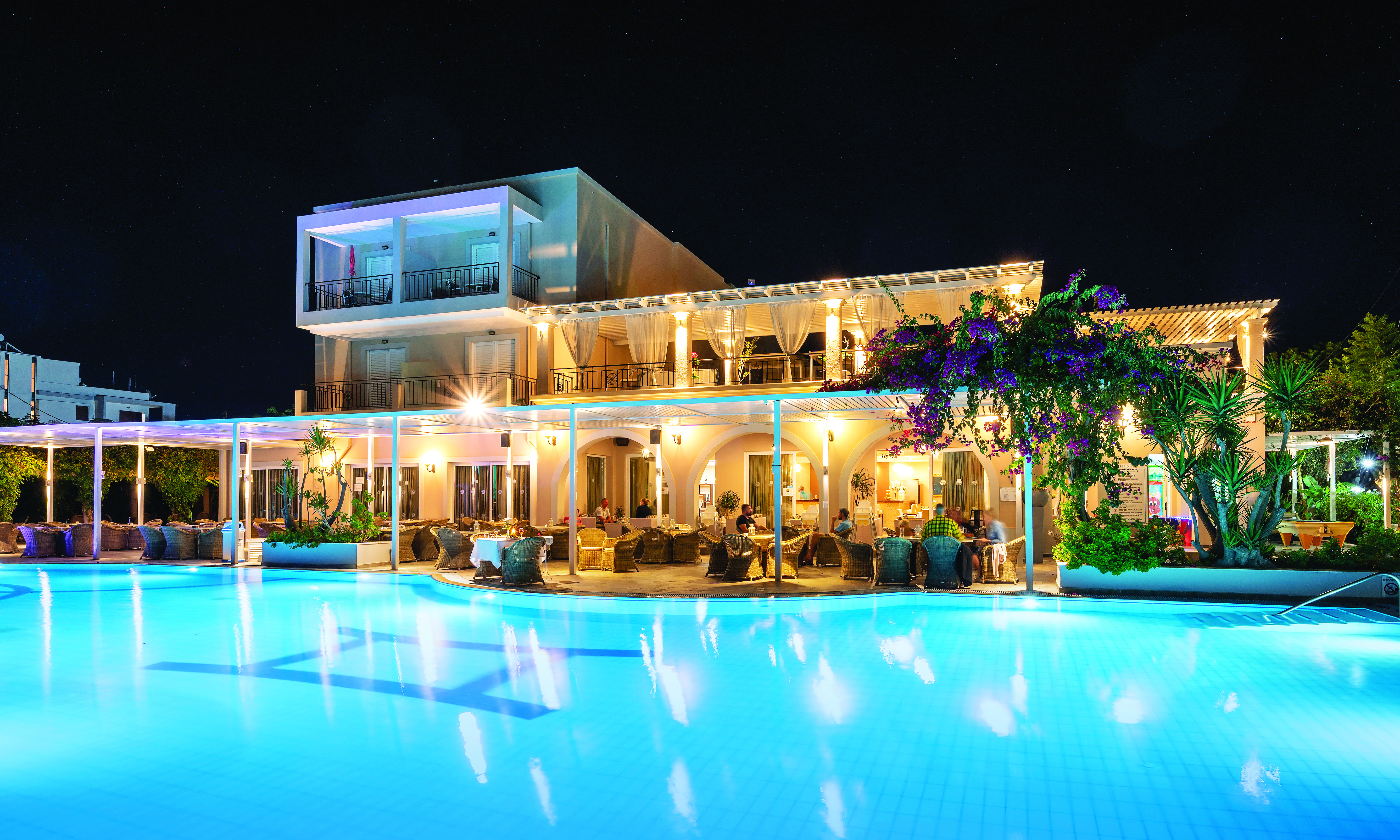 The hotel’s restaurant dishes up Greek and international fare, and you can sip colourful cocktails at the bar. Families are well looked after, with a kids’ club, a splash pool and an outdoor playground. And grown ups can unwind in the spa.