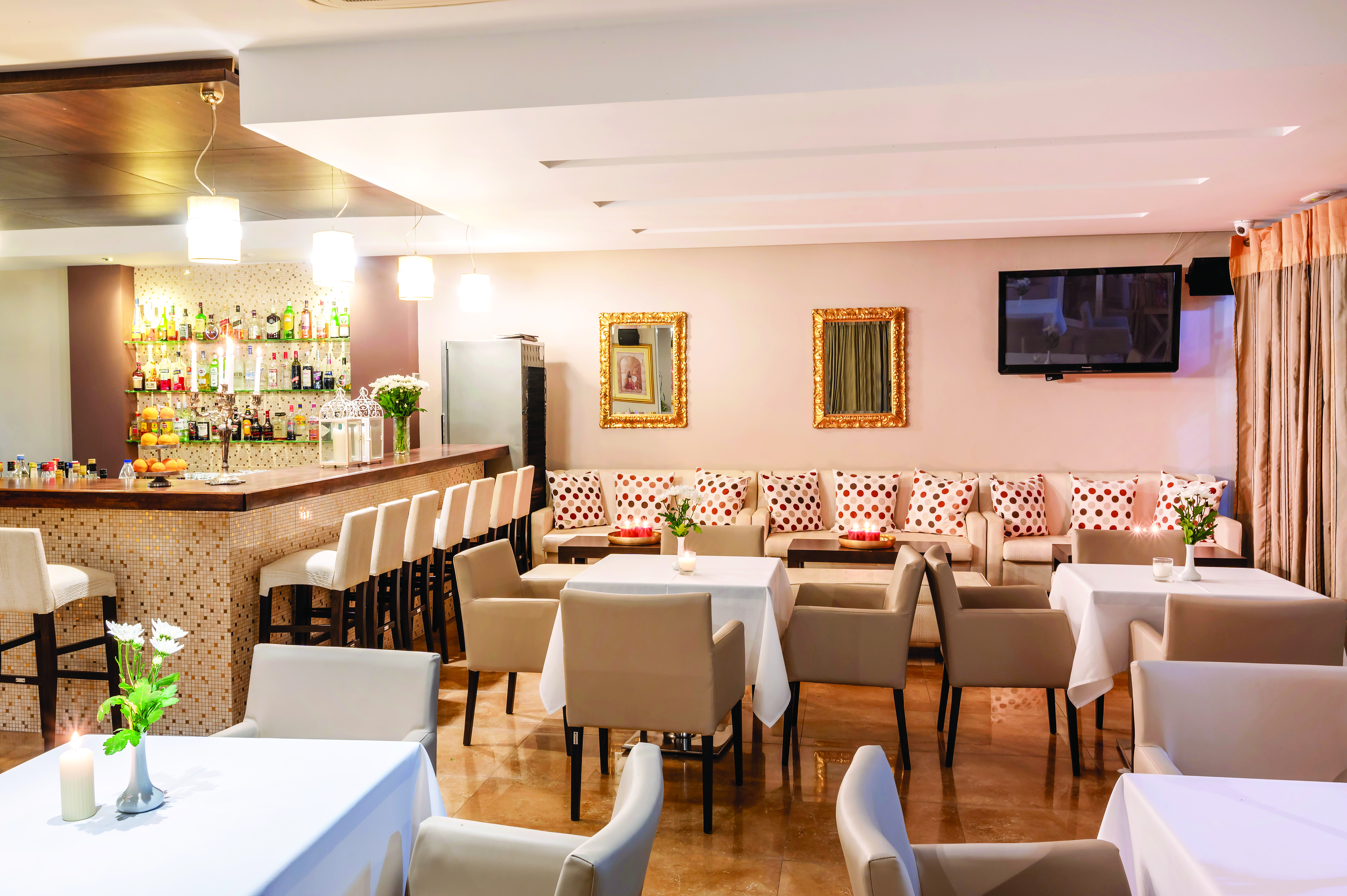 The restaurant overlooks the pool, and it serves up international and Greek fare. Plus, the bar’s got a drinks list as long as your arm.