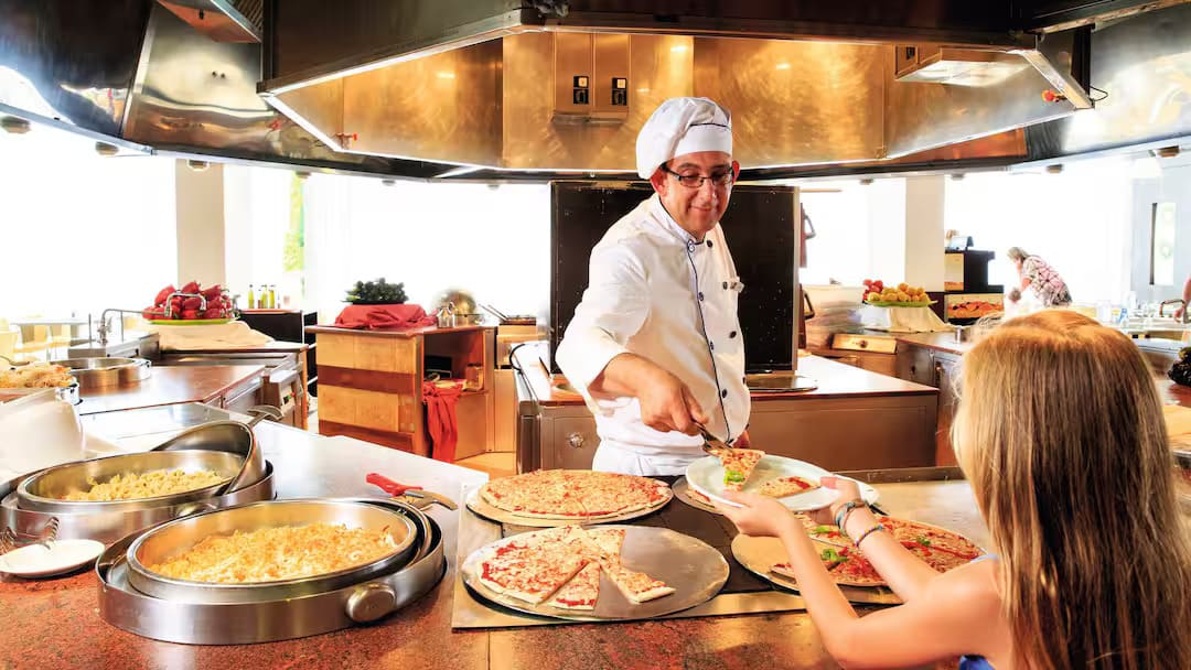 Themed nights are the order of the day in the three buffet restaurants. You can try a different cuisine every night, from Italian to Tex-Mex. Plus there’s a burger bar right by the lake.