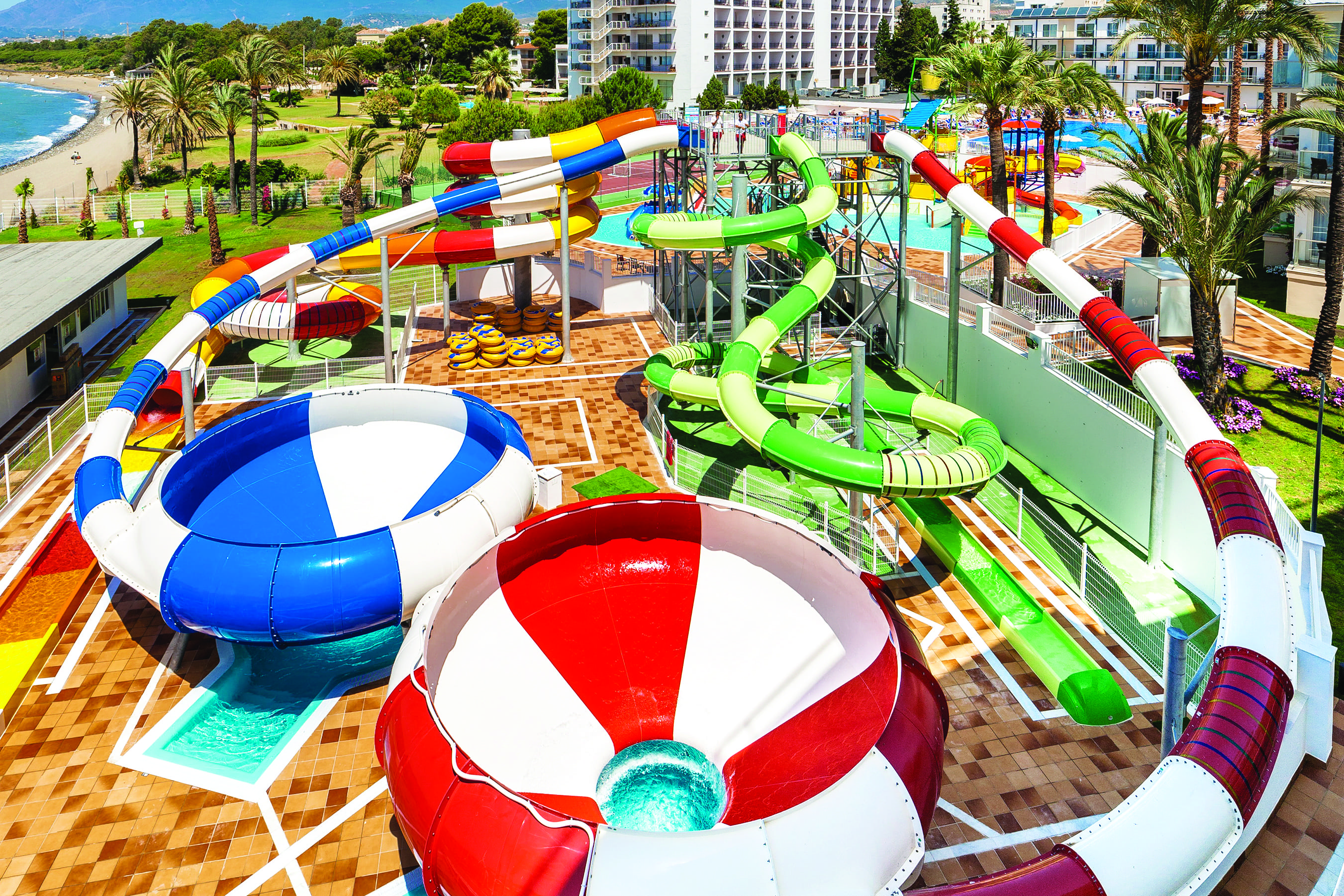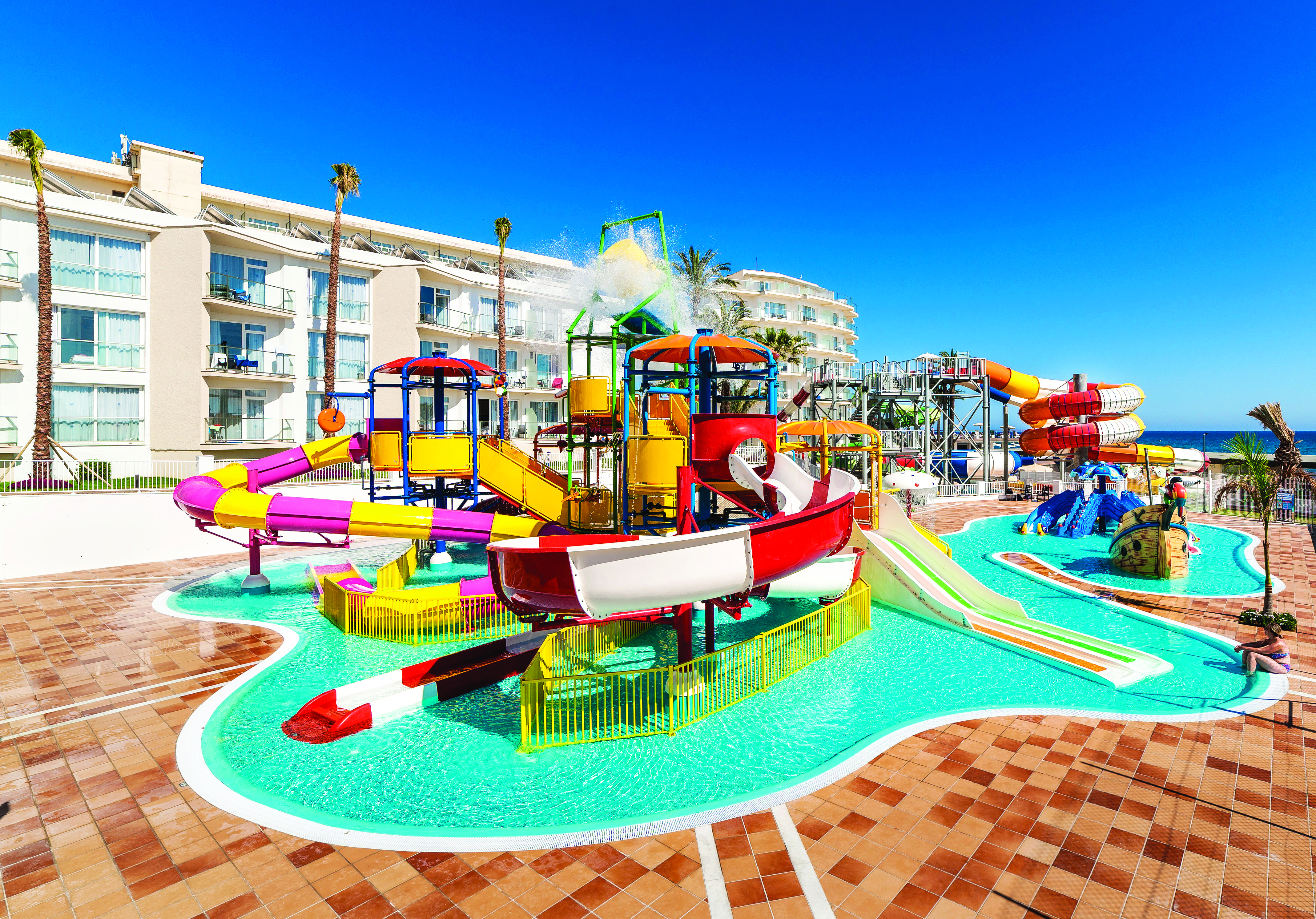 Back at base, you’ve got free entry to a sea-view waterpark. It’s home to high-speed slides and space bowls, as well as a kids’ splash park that’s filled with water fountains and tipping buckets.