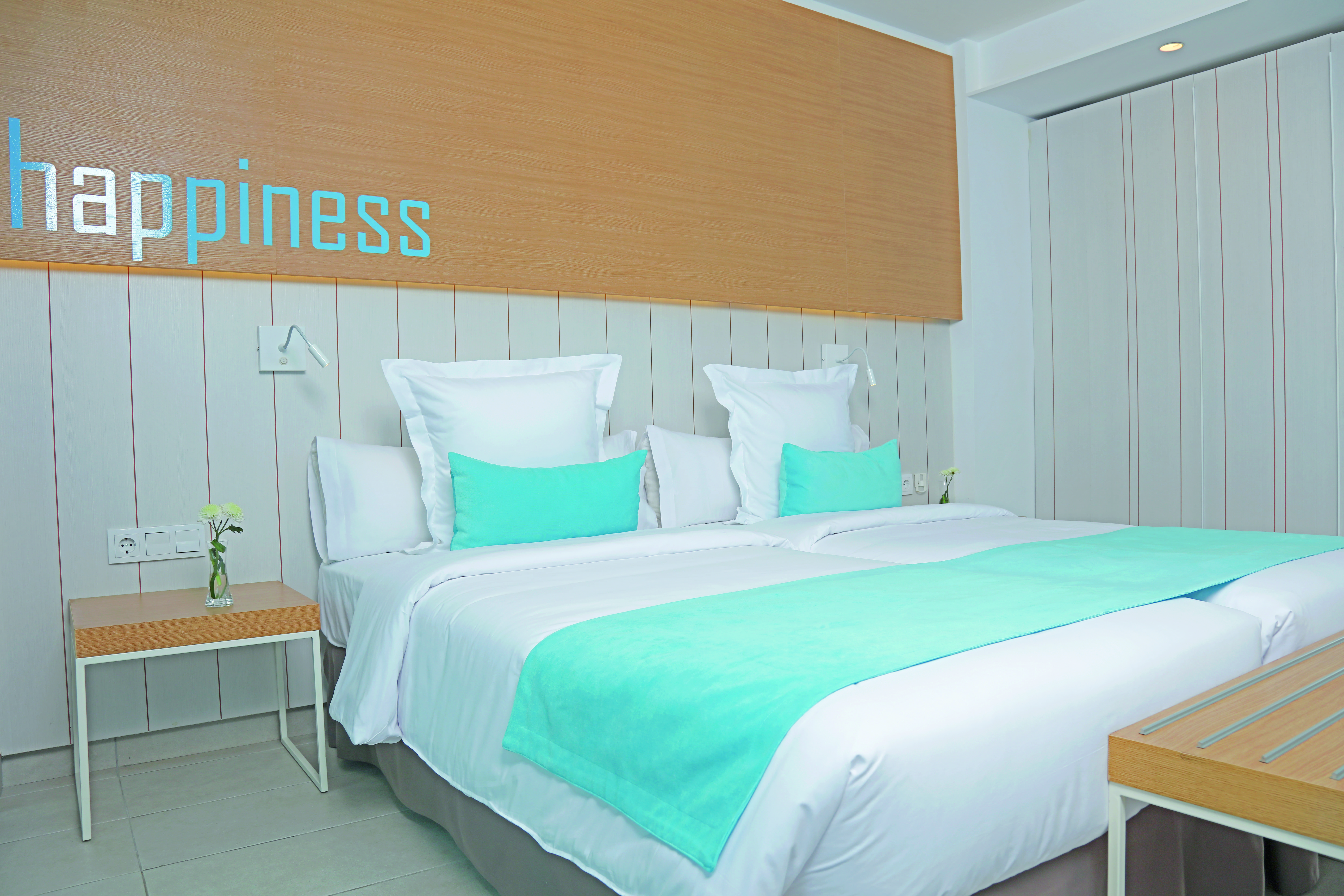 A triangle-shaped pool takes centre stage on the palm-and-sunlounger dotted terrace. Meals, meanwhile, are taken care of in the buffet restaurant, and snacks and drinks are served over at the bar.