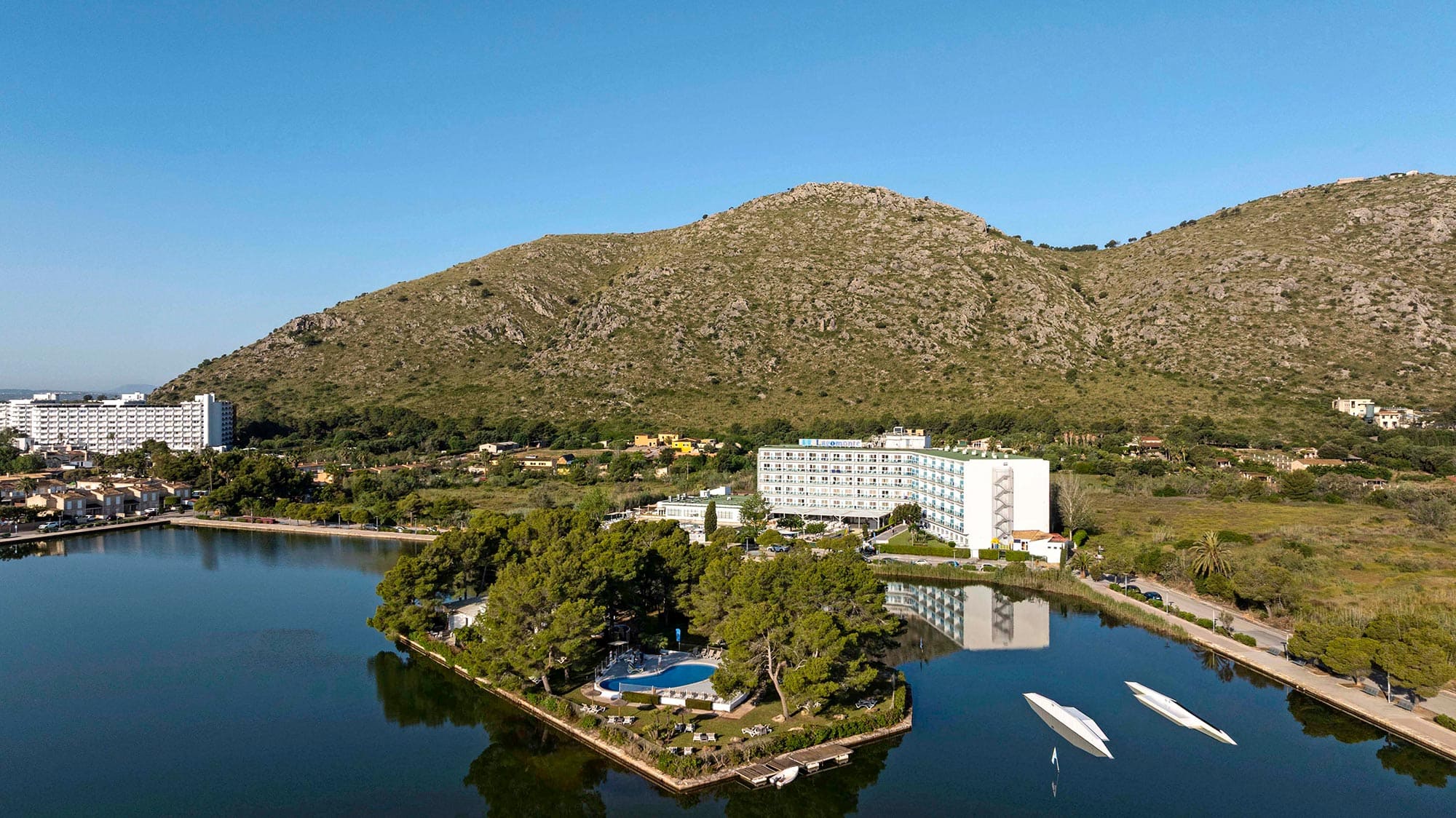 This hotel’s pulled up next to a lake in Port d’Alcudia. There’s an island in the middle of the lagoon, where you’ll find one of the hotel’s pools.