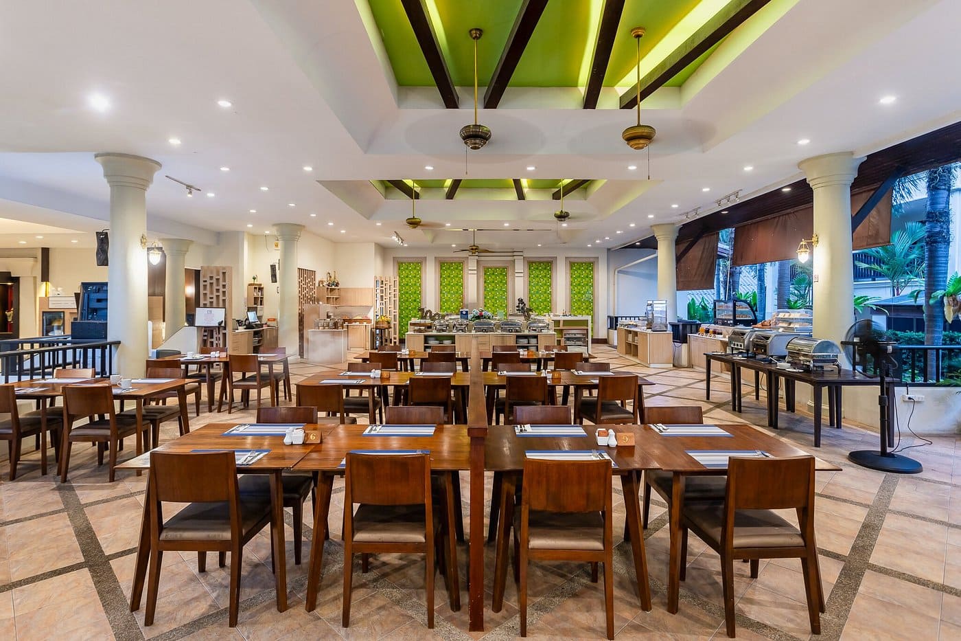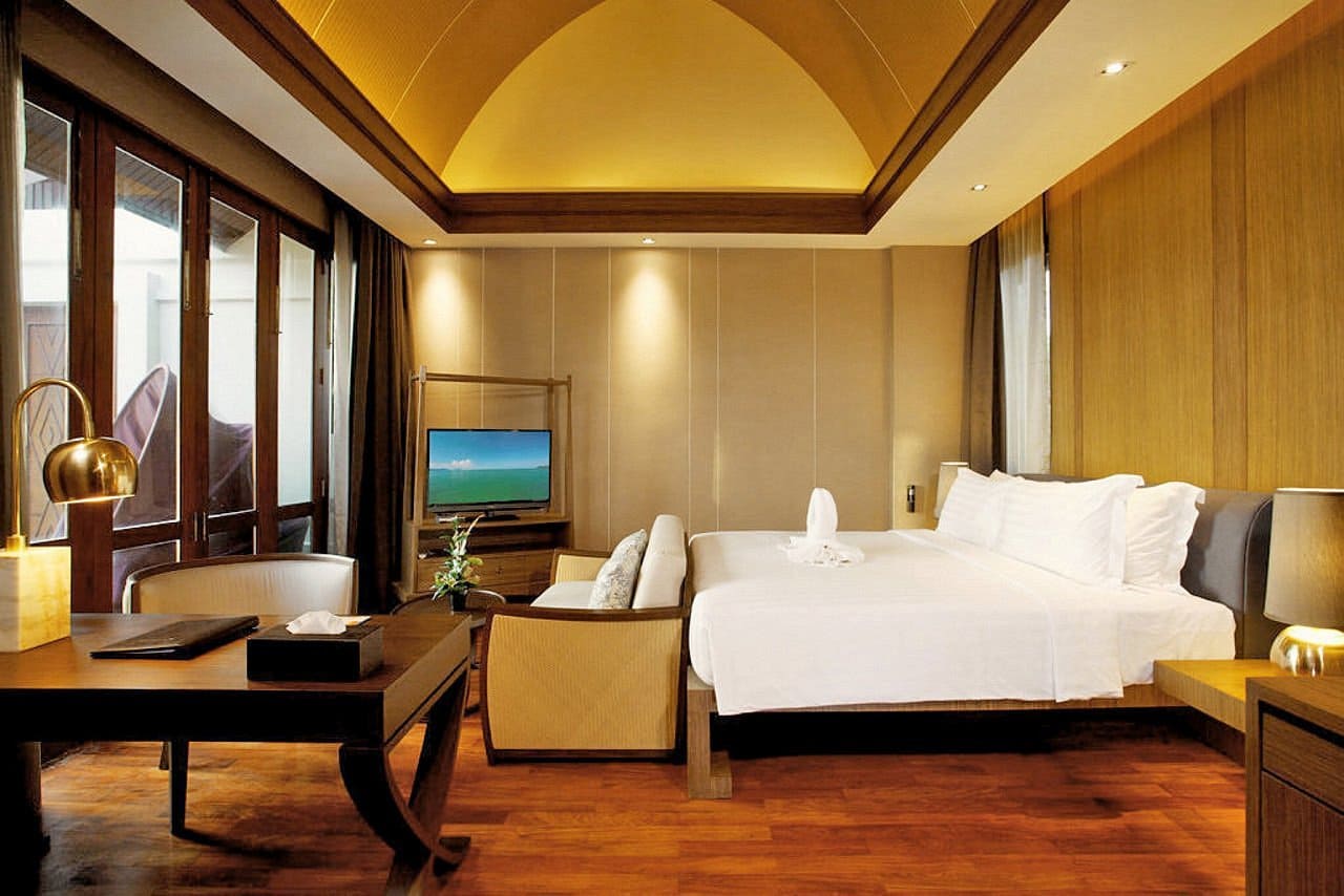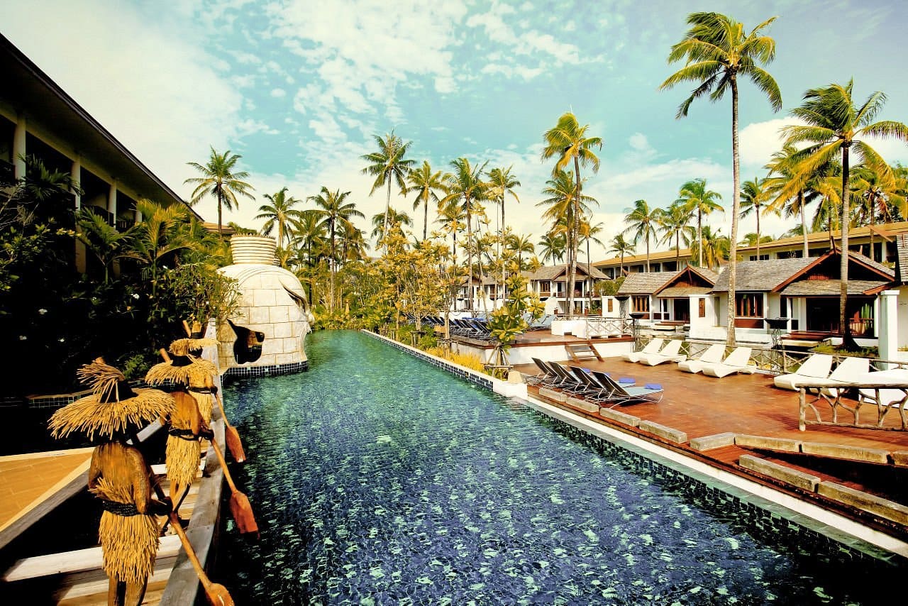 This whole place screams Thailand, with tropical gardens all over the place, wooden Thai-themed decorations in the main pool, open-air dining and the country’s trademark steep sloping rooftops. If that’s not enough to remind you where you are, walk a few steps and you can make footprints on soft white sand and dip your toe in the Andaman Sea.