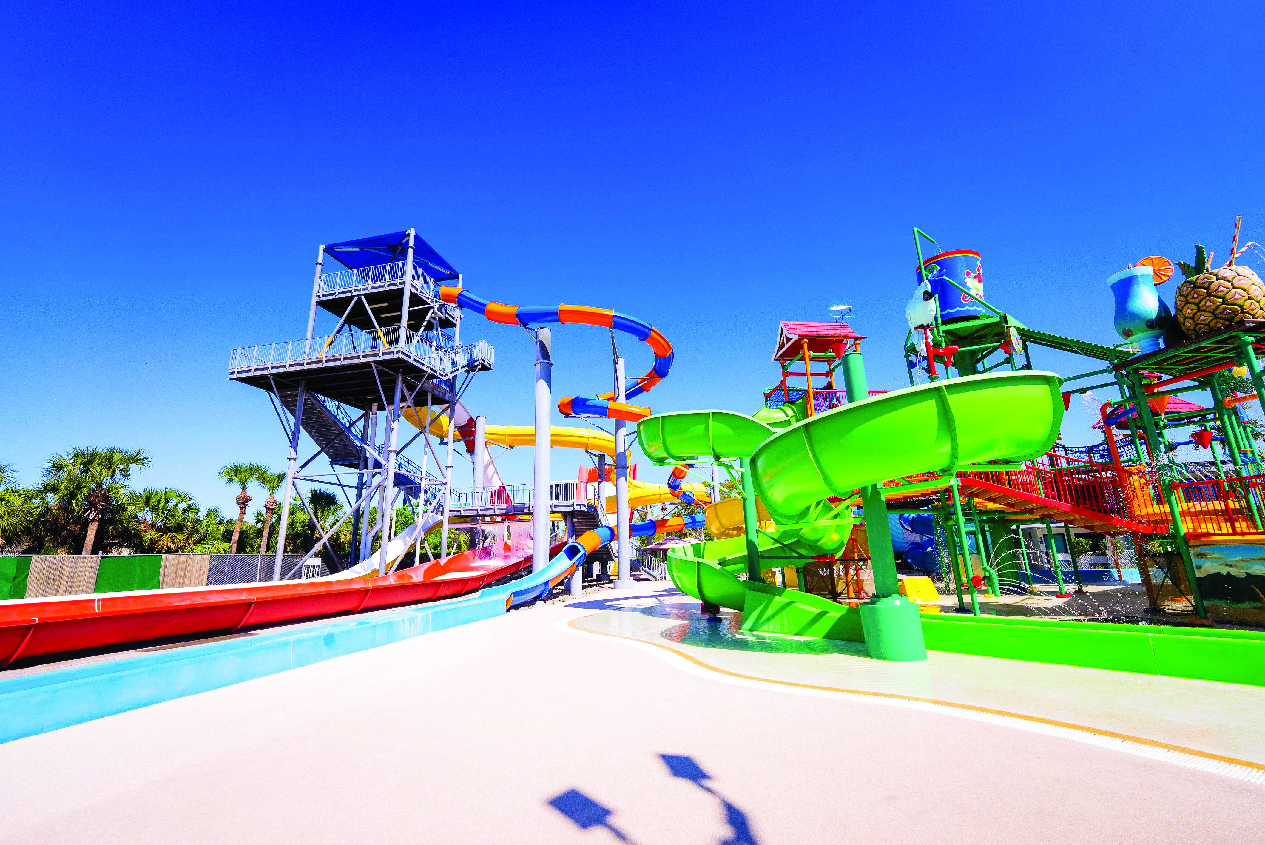 This place's home to a huge waterpark with 14 slides. And when you start to get hungry, you've got a tiki bar and a couple of eateries to choose from.